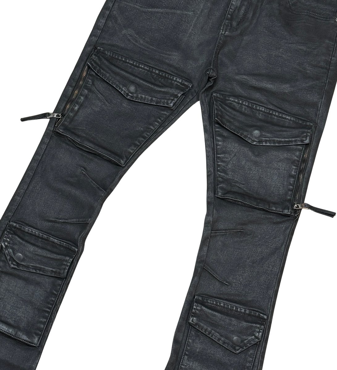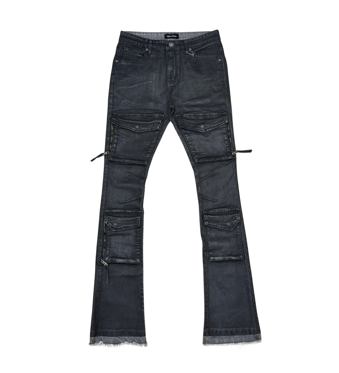 VICIOUS MEN WAX COATED MULTI CARGO FLARE DENIM JEAN